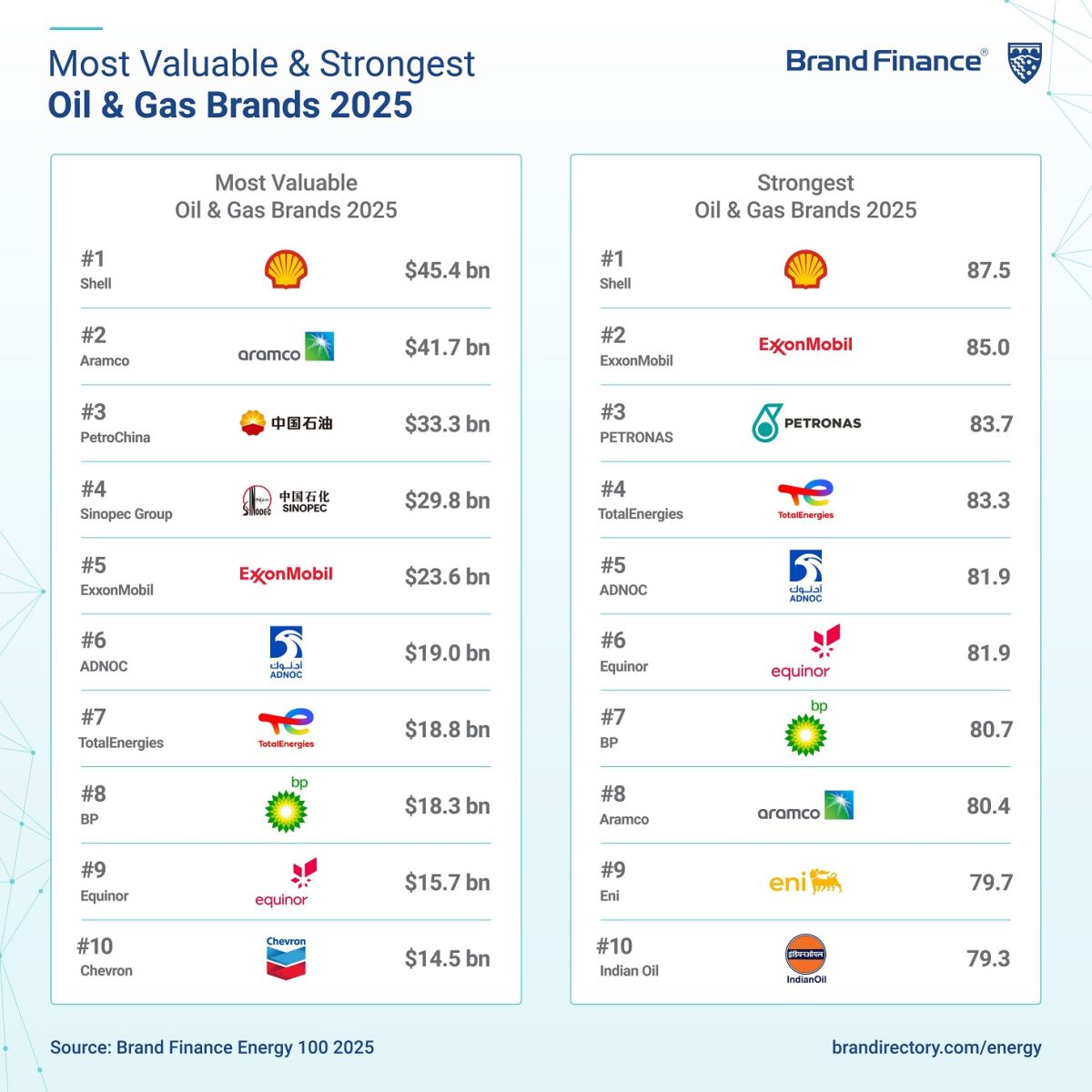 Bảng xếp hạng Những thương hiệu Dầu Khí giá trị nhất thế giới 2025 từ Brand Finance